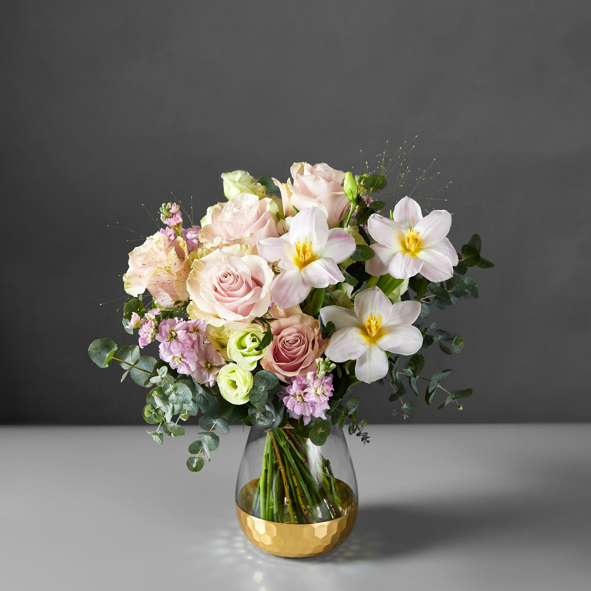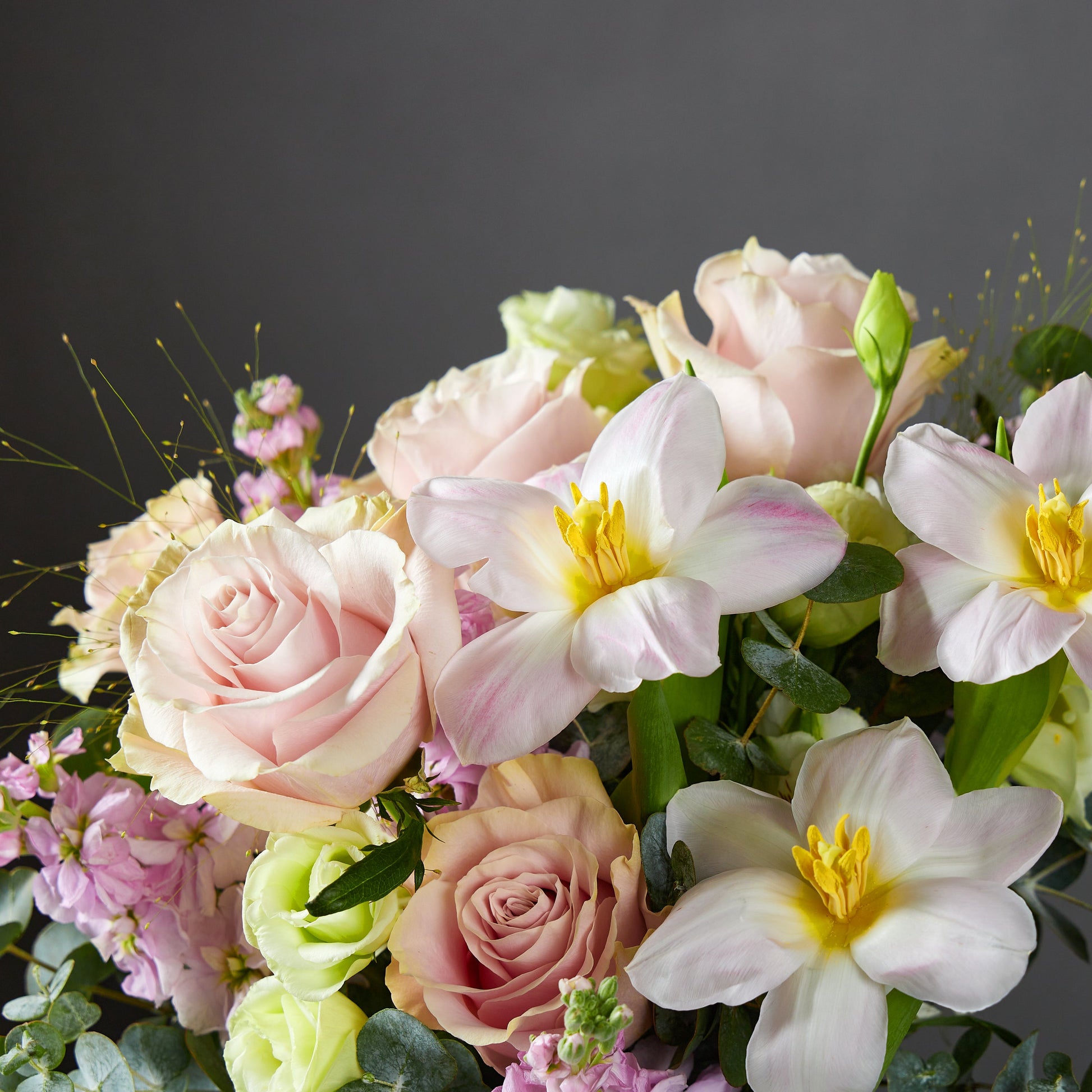 ^Tulip, Rose, Alstromeria, Eustoma, Stock & Greenery