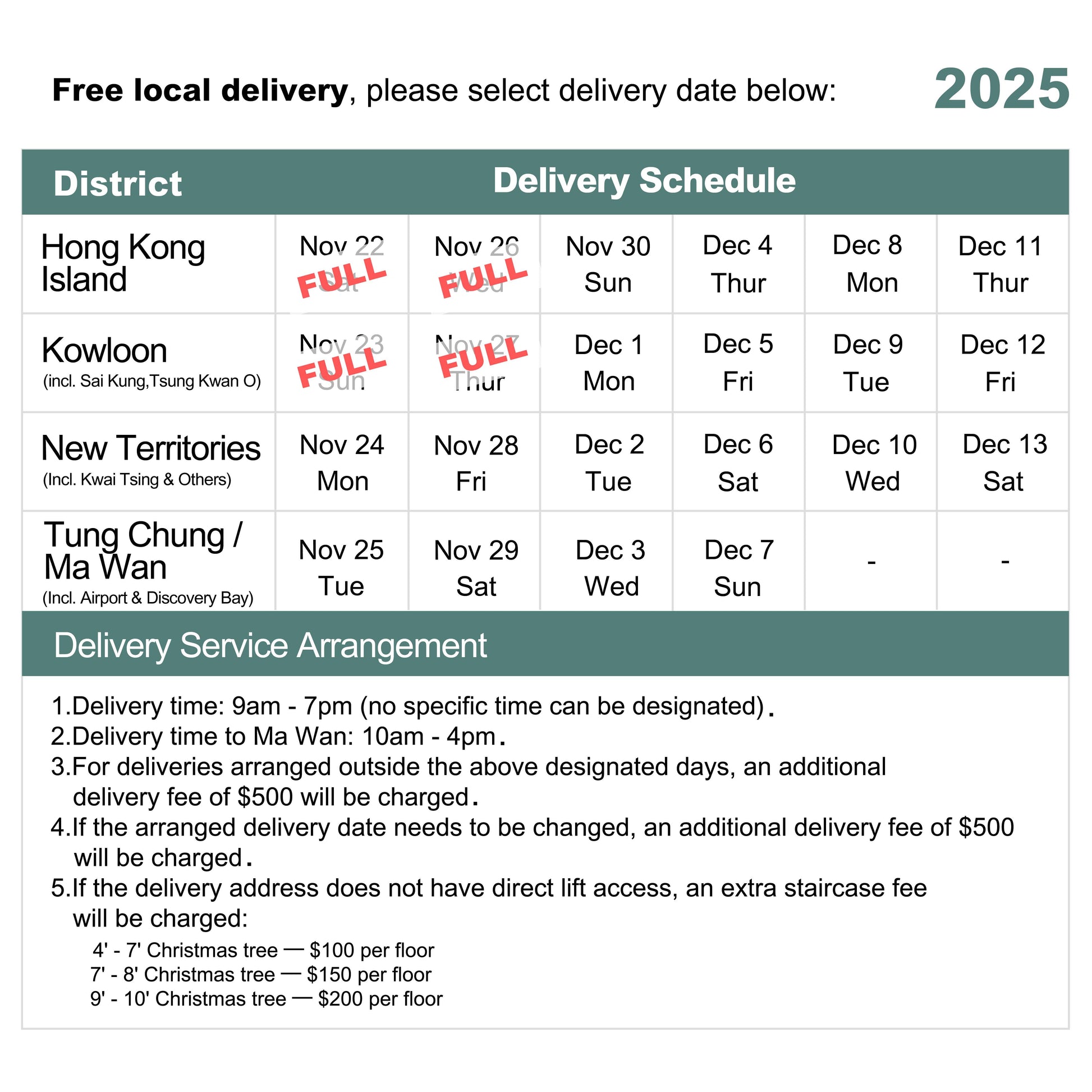 (2) Delivery is limited to truck-accessible stops with lift access. Additional charges apply if stairs are involved for moving or delivery, or in special cases such as village houses/villas where vehicles cannot reach the entrance.